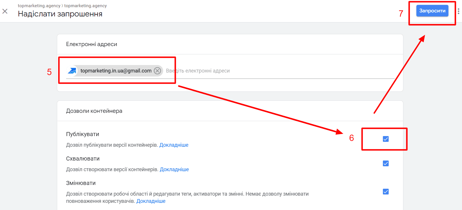 Скопіюйте нашу пошту topmarketing.in.ua@gmail.com в поле "Електронні адреси" (5), потім виберіть тип доступу "Публікувати" (6) та натисніть "Запросити" (7).