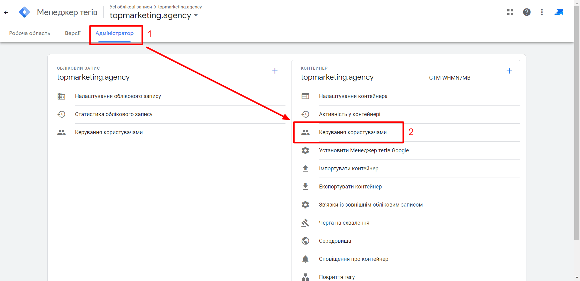 Google Tag Manager, натисніть "Адміністратор" (1), потім "Керування користувачами" (2).