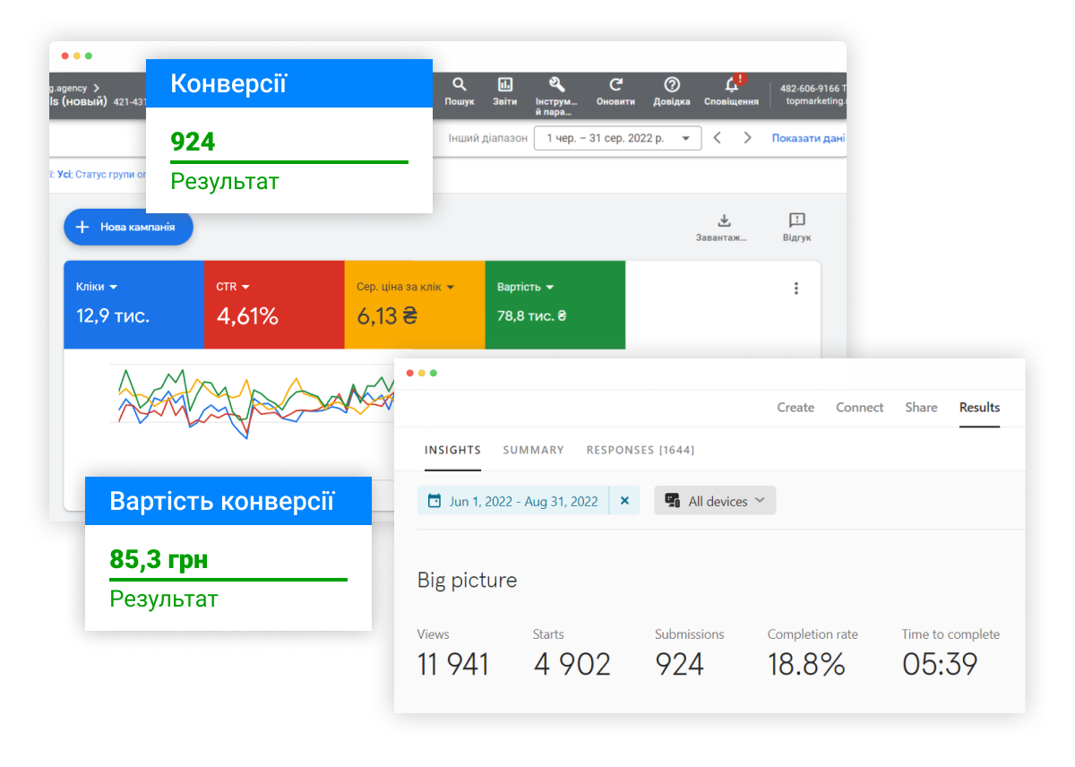 Вже через 4 місяці роботи нам вдалося збільшити кількість заявок до 455 на місяць, це майже в 9 разів більше ніж спочатку. Але, що найцікавіше - таких результатів вдалося досягти не піднімаючи рекламний бюджет, тобто за ті самі гроші, що на старті. Клієнт задоволений, співпрацюємо з ним і досі.